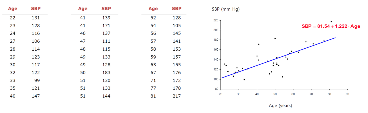 33명의 성인 여성에 대한 나이와 혈압 데이터 기반의 예측 모델 ( 종속 변수 Y = 1.222 )